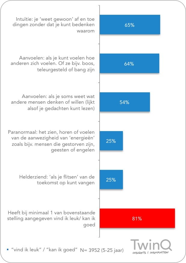 Uit ons onderzoek blijkt tevens dat de kinderen en jongeren van generatie Zenz hun zesde zintuig meer hebben ontwikkeld dan wij normaal gesproken aannemen, dan wat in onze huidige maatschappij ‘normaal’ is. Niet alleen tijdens de gesprekken maar ook uit de cijfers blijkt dat een groot deel van deze kinderen en jongeren hun zesde zintuig gebruiken en veel zien, horen of voelen. Dat ze gedachten lijken te kunnen lezen, intuïtief zomaar iets weten dat ze niet kunnen weten, kunnen voelen of er in een ruimte bijv. ruzie is geweest, of iemand te vertrouwen is, gestrest, verdrietig of boos is… en dat niet alleen. Een deel van hen geeft in het diepste vertrouwen zelfs toe dat ze de aanwezigheid van overledenen kunnen voelen, horen of zien of zelfs met hen kunnen communiceren! Voor het ene kind heel gewoon maar voor de ander heel beangstigend…